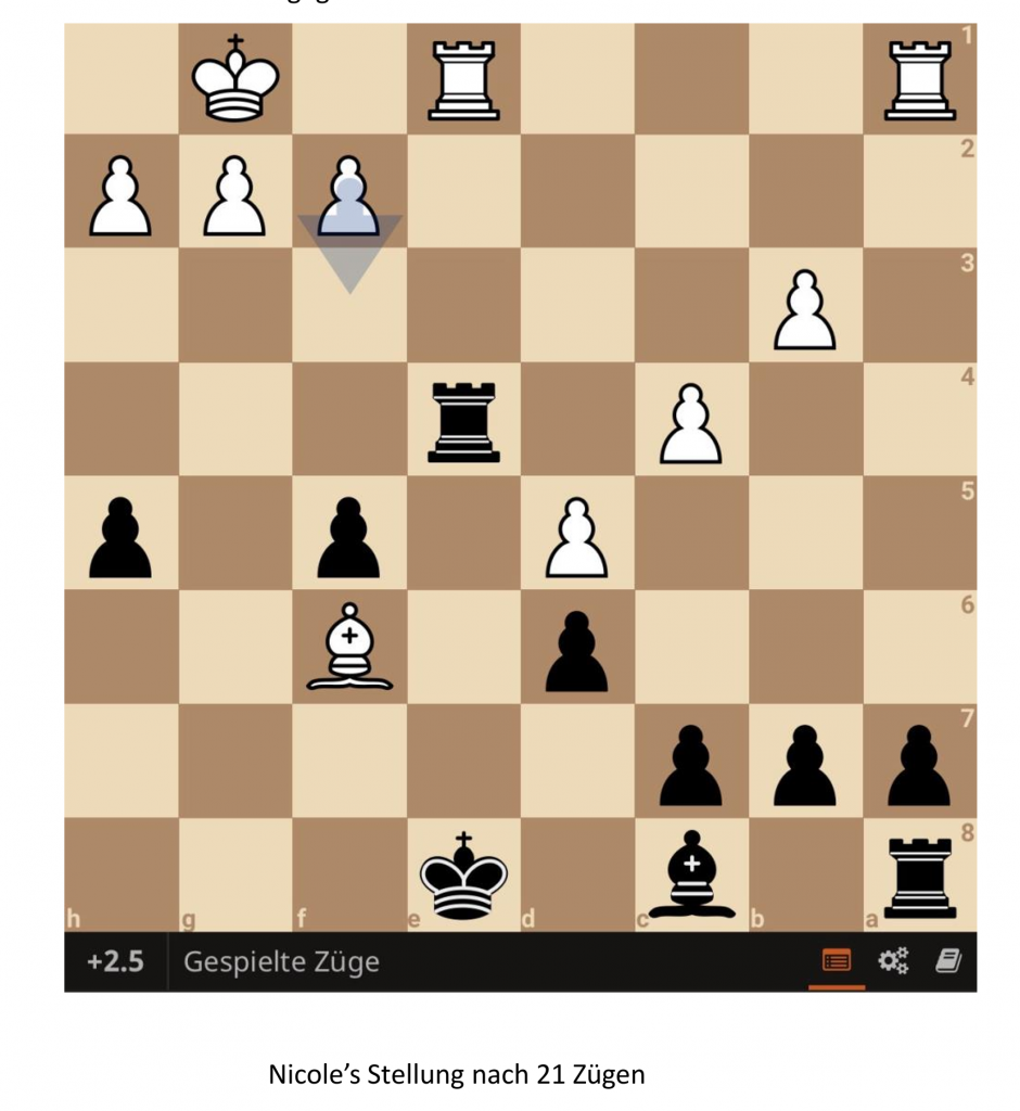 Entscheidung sorgen! Nicole hatte dabei eine sehr wilde Partie mit vielen Höhen und Tiefen. Nach 13 Zügen konnte sie einen Bauer gewinnen und stand dementsprechend auch -1. Aber im 19.Zug sollte sich das Blatt komplett wenden, denn Nicole spielt König d8 und übersieht,