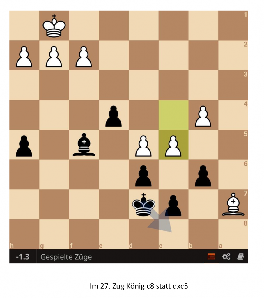 3 Züge später nimmt ihr Gegner den Bauer auf a7 mit und Nicole konnte den Läufer mit b6 erst einmal einsperren und verpasste es danach sich daraus einen Vorteil zu verschaffen, der jedoch schwer zu finden war.